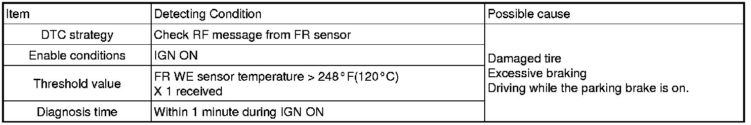 This DTC indicates that the Front Right WE sensor has seen a temperature in excess of 248 °F (120 °C). This warning is to notify the driver that there is a problem that may affect sensor performance.