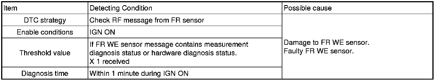 The WE sensor is equipped with a Radio Frequency (RF) transmitter circuit which is used to periodically broadcast information from inside the tire. All WE sensor units operate on the same RF channel frequency, and each broadcast message includes pressure and temperature data, a unique ID code, operating state data, status information, and digital error-detection data.