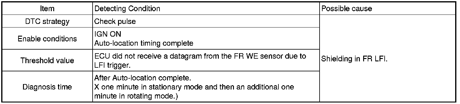 This DTC indicates that Auto-location timing is completed AND ECU did not receive a datagram from the Front Right WE sensor due to LFI trigger. The most likely cause is a transmission obstacle.