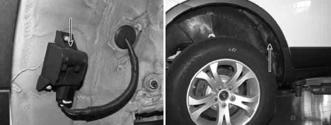 The LFI is located at each vehicle wheel house (F/L, F/R, R/L, R/R). Only HIGH-LINE systems are fitted with LFI units. An LFI unit is mounted in each wheel well of a vehicle to enable the Receiver unit to determine the vehicle position of each WE for which it has a stored ID code. Using a digital bi-directional serial CONTROL line to each LFI, the Receiver can activate an LFI to send out an LF message and trigger the WE sensor near its location to respond with an RF transmission. By activating the LFI units one at a time, the Receiver can automatically locate the vehicle position of each WE. For fault detection, the LFI will report back its "operating properly" status to the Receiver via the CONTROL line.