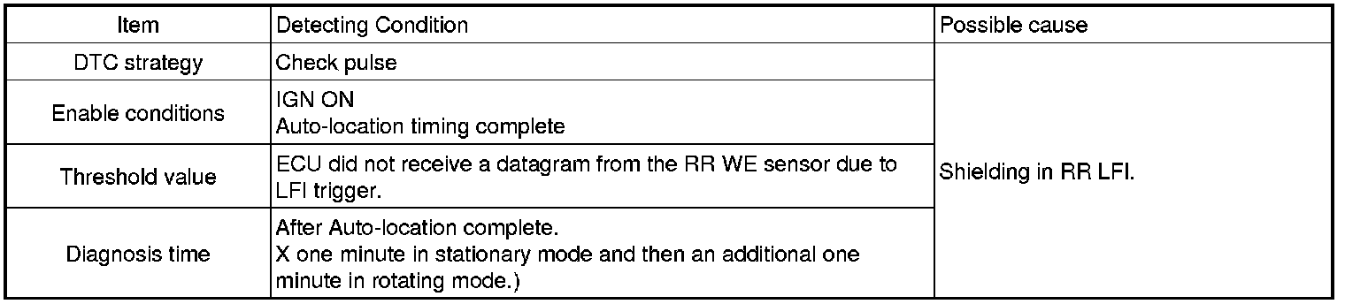 This DTC indicates that Auto-location timing is completed AND ECU did not receive a datagram from the Rear Right WE sensor due to LFI trigger. The most likely cause is a transmission obstacle.