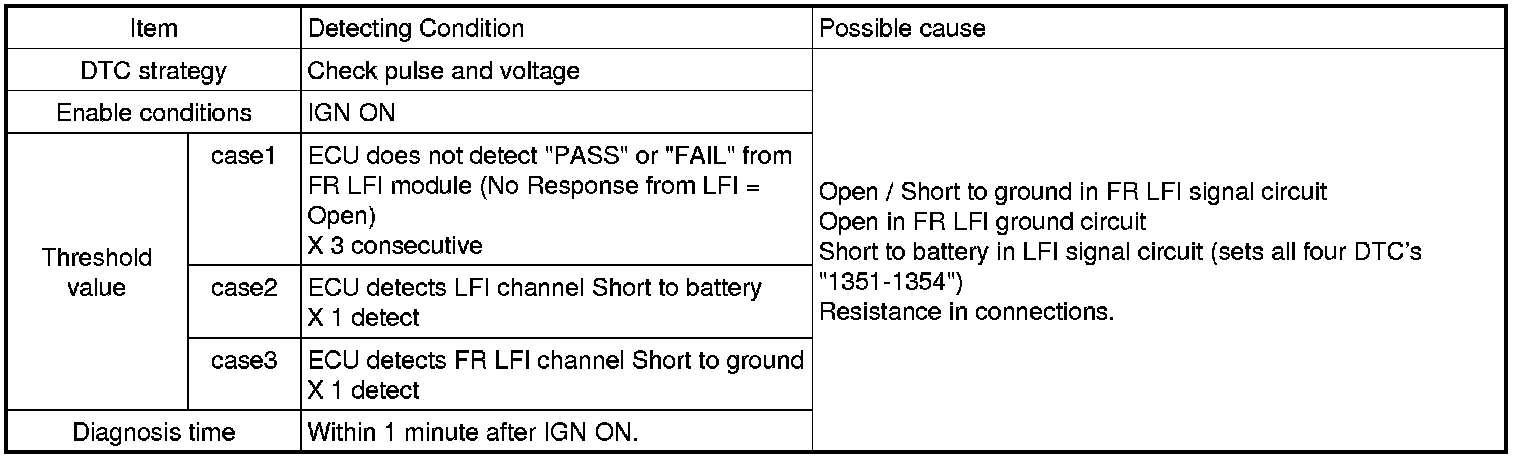 This DTC indicates that ECU does not detect "PASS" or "FAIL" pulse from Front Right LFI module (No Response from LFI = Open). -OR- ECU detects Open, Short to battery/ground in LFI Signal Circuit or Open in Ground. If this DTC is detected, ECU sets additionally 'C1313' after LFI activity cycle. Also ECU sets all four DTC's (1351-1354) if one or more Signal Circuit are shorted to battery.