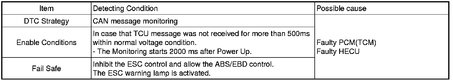 The HECU checks the CAN communication lines for normal ESC control, and sets this code if an TCM message is not received within 500 ms.