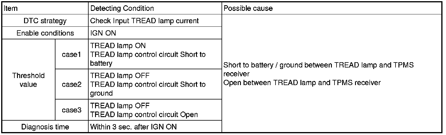 The TPMS display device is located on the instrument cluster to provide information about TPMS operating conditions and tire pressure. The TPMS display device is consist of TREAD indicator lamp, Location lamp and TPMS Warning indicator lamp. The TREAD indicator lamp is turned on when pressure of one or more tires are below the warning limit level. And then, the location lamp displays the tire position that is the pressure below the warning limit level. The TPMS Warning indicator lamp is turned on if there is the failure in the system.