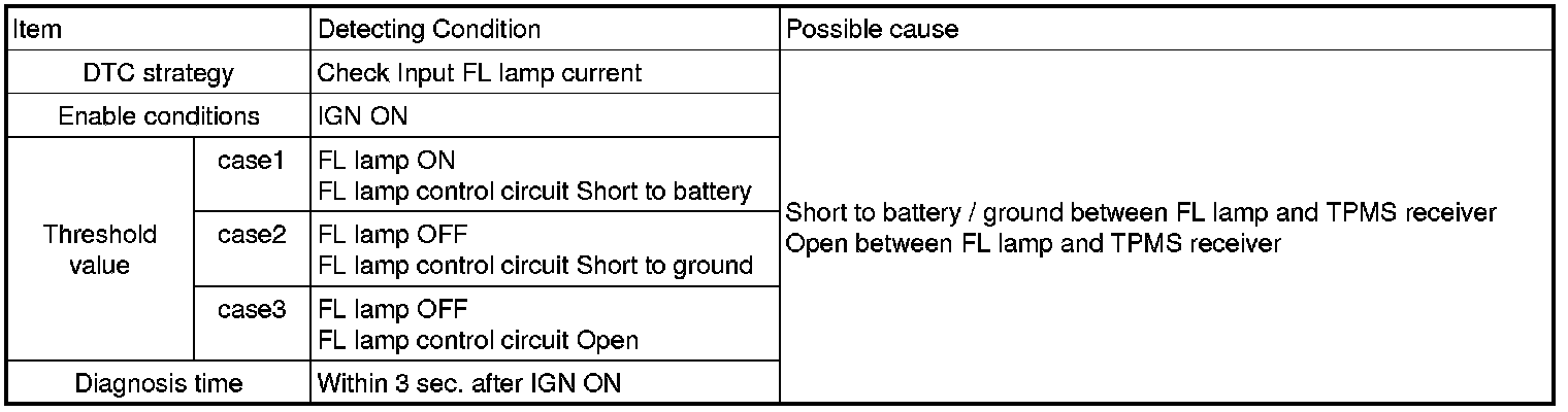 The TPMS display device is located on the instrument cluster to provide information about TPMS operating conditions and tire pressure. The TPMS display device is consist of TREAD indicator lamp, Location lamp and TPMS Warning indicator lamp. The TREAD indicator lamp is turned on when pressure of one or more tires are below the warning limit level. And then, the location lamp displays the tire position that is the pressure below the warning limit level. The TPMS Warning indicator lamp is turned on if there is the failure in the system.