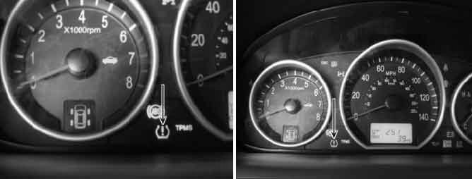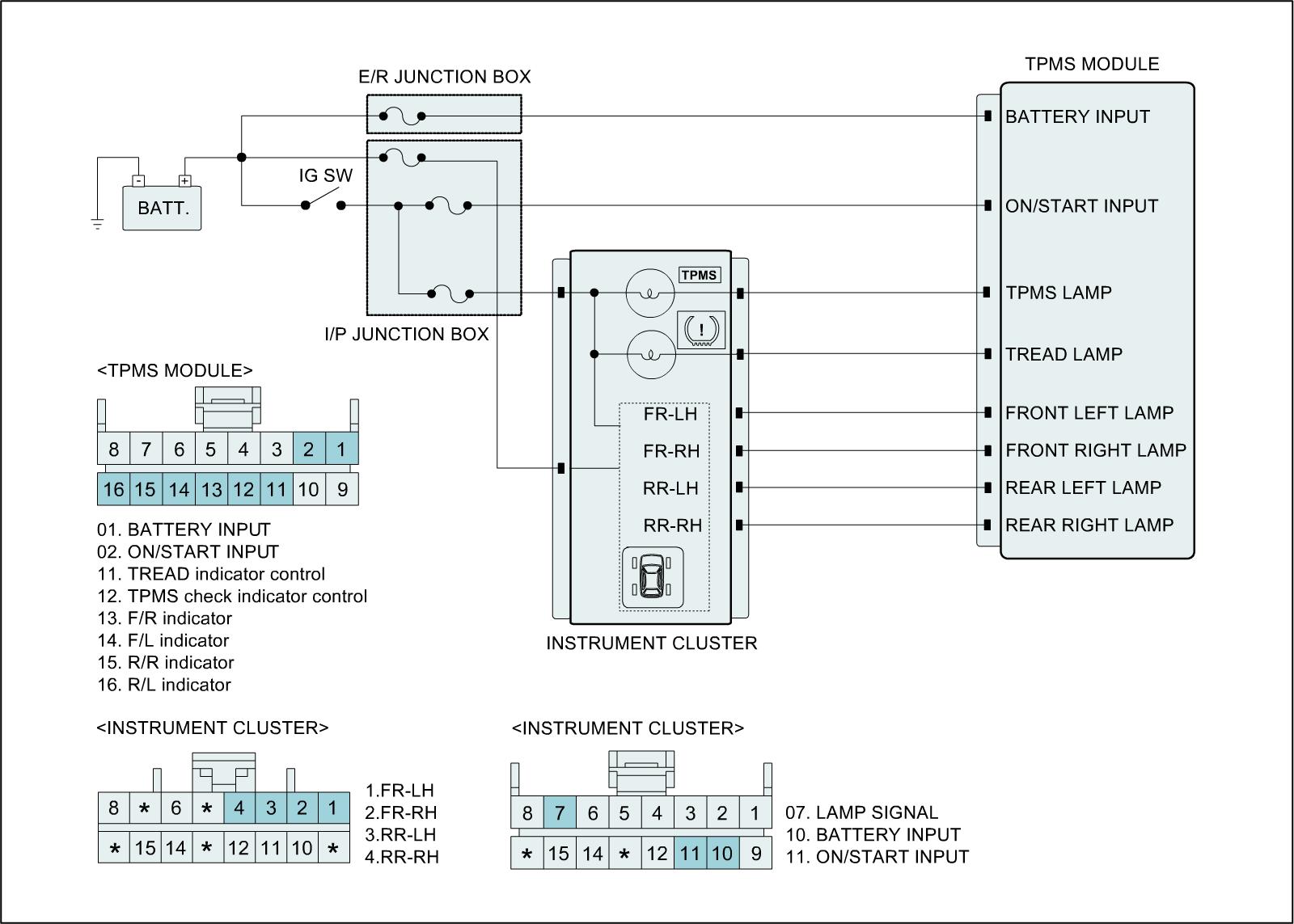 The TPMS display device is located on the instrument cluster to provide information about TPMS operating conditions and tire pressure. The TPMS display device is consist of TREAD indicator lamp, Location lamp and TPMS Warning indicator lamp. The TREAD indicator lamp is turned on when pressure of one or more tires are below the warning limit level. And then, the location lamp displays the tire position that is the pressure below the warning limit level. The TPMS Warning indicator lamp is turned on if there is the failure in the system.