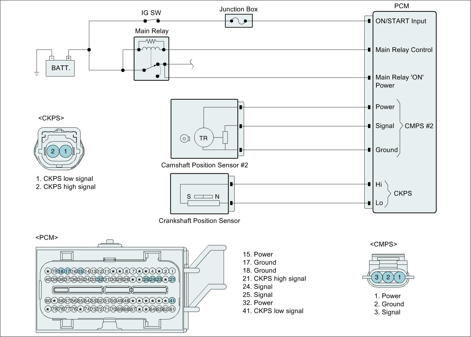 This example shows a typical Crankshaft Position Sensor (CKPS) and Camshaft Position Sensor (CMPS) waveform at idle. If the 17th signal of the CKPS after missing tooth is aligned with the high signal of the CMPS at idle, PCM recognizes that Synchronization between CKPS and CMPS is completed.