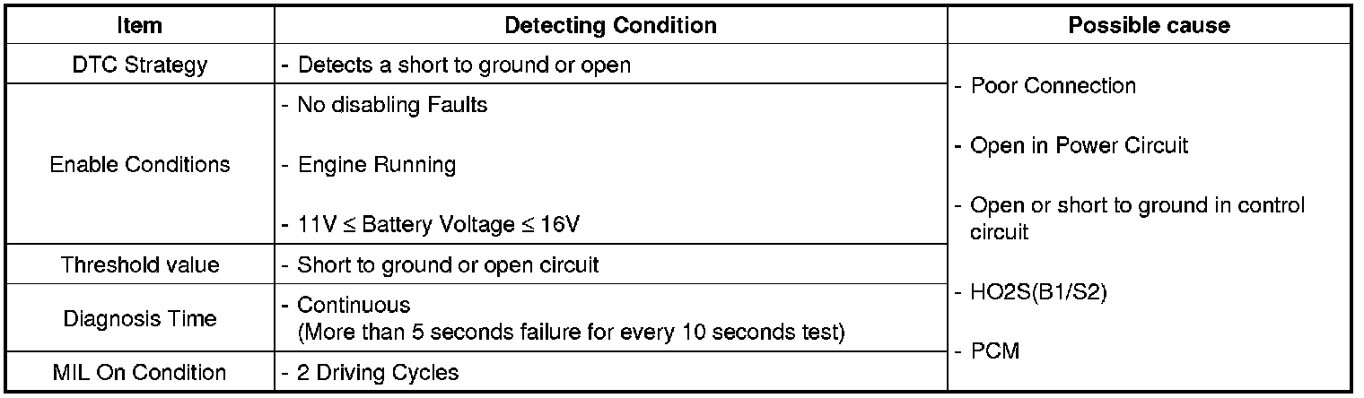 If the PCM detects short to ground or open in heater under detecting conditions, PCM sets P0037. MIL (Malfunction Indication Lamp) turns on when the malfunction lasts till consecutive 2 driving cycle.