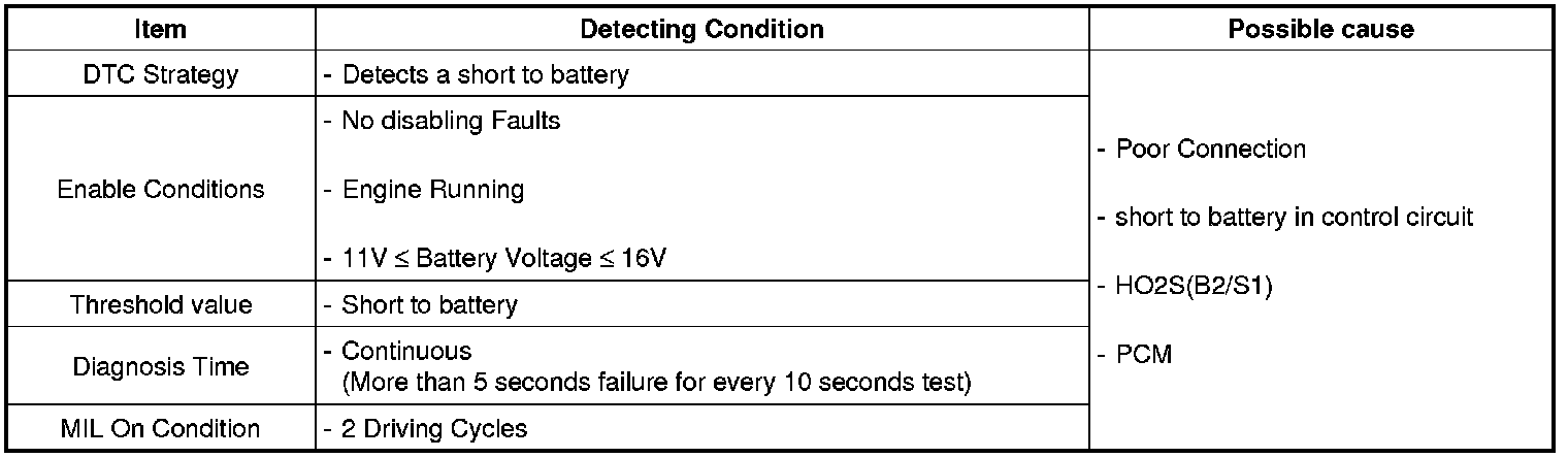 If the PCM detects short to battery in heater under detecting conditions, PCM sets P0052. MIL (Malfunction Indication Lamp) turns on when the malfunction lasts till consecutive 2 driving cycle.
