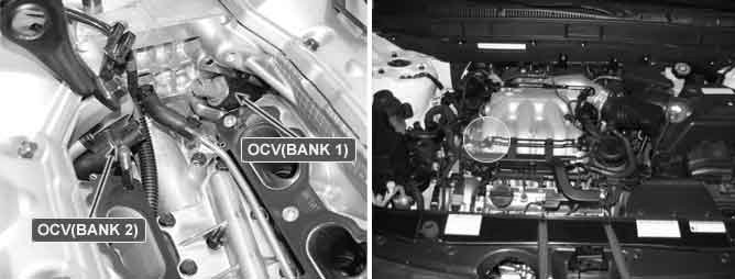 The CVVT (Continuously Variable Valve Timing) system is installed to the chain sprocket of the intake camshaft. This system controls the intake camshaft to provide the optimal valve timing for every driving condition. The PCM controls the Oil Control Valve (OCV), based on the signals output from mass air flow, throttle position and engine coolant temperature. The CVVT controller regulates the intake camshaft angle using oil pressure through the OCV. As result, the relative position between the camshaft and the crankshaft becomes optimal, and the engine torque improves, fuel economy improves, exhaust emissions decrease under overall driving conditions.