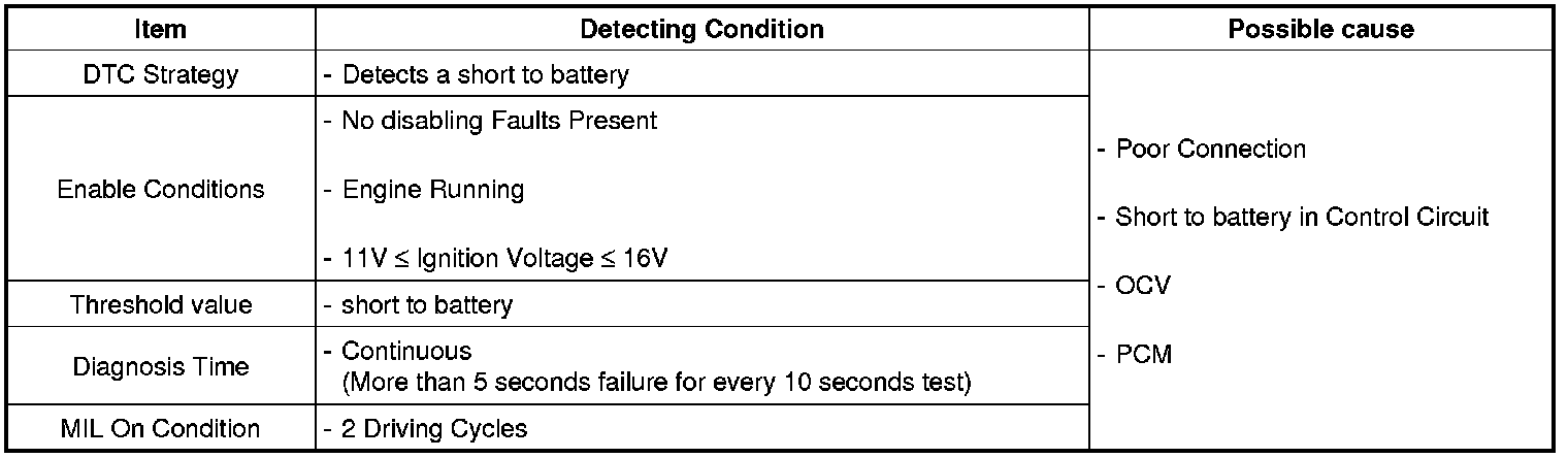 When the enable condition is satisfied, the PCM checks that OCV outputs (Voltage level) are observed when OCVs are commanded. When a OCV output failure is detected, the appropriate fail counter is incremented.