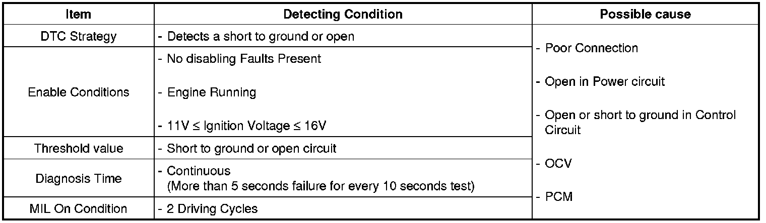 When the enable condition is satisfied, the PCM checks that OCV outputs (Voltage level) are observed when OCVs are commanded. When a OCV output failure is detected, the appropriate fail counter is incremented.
