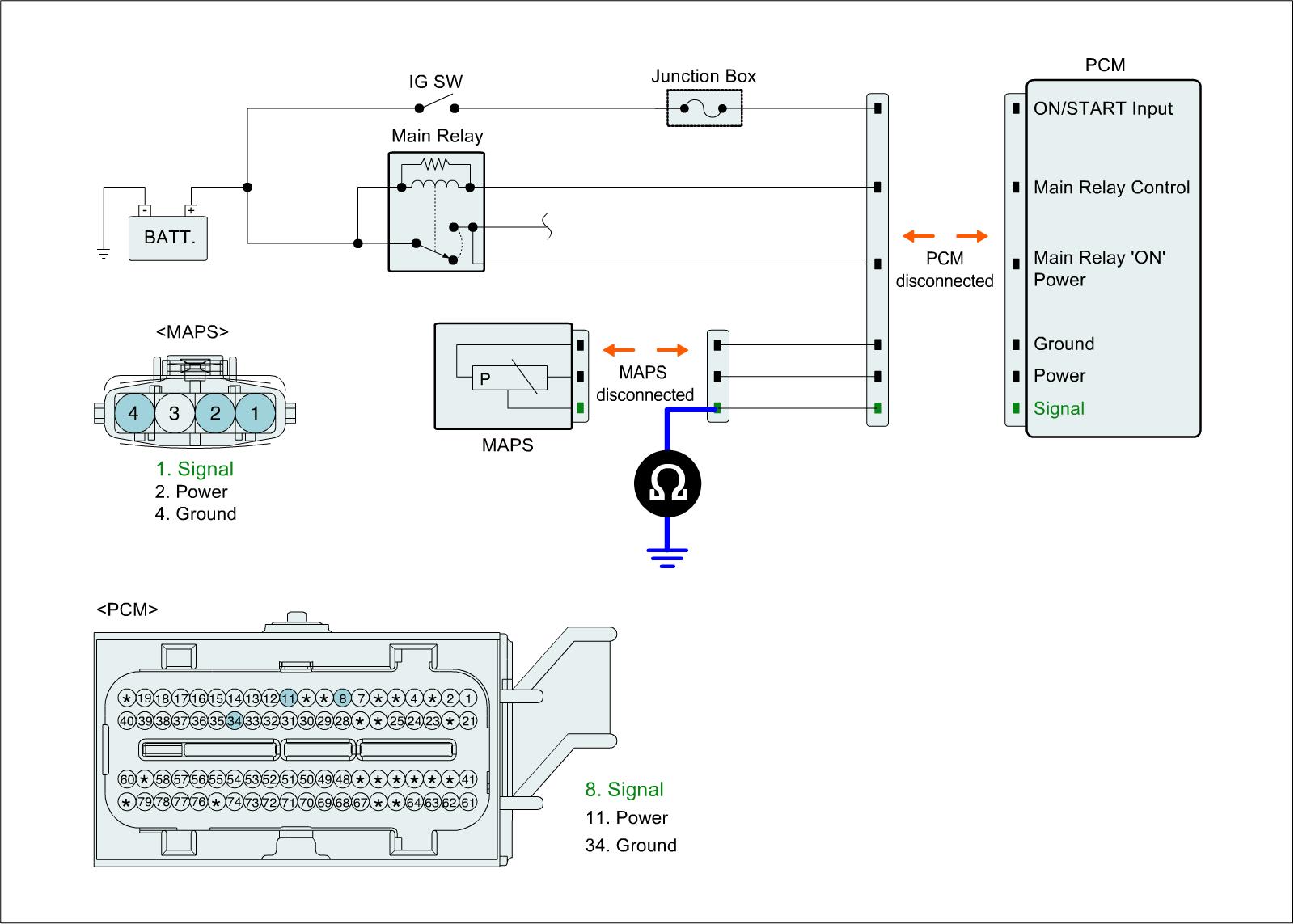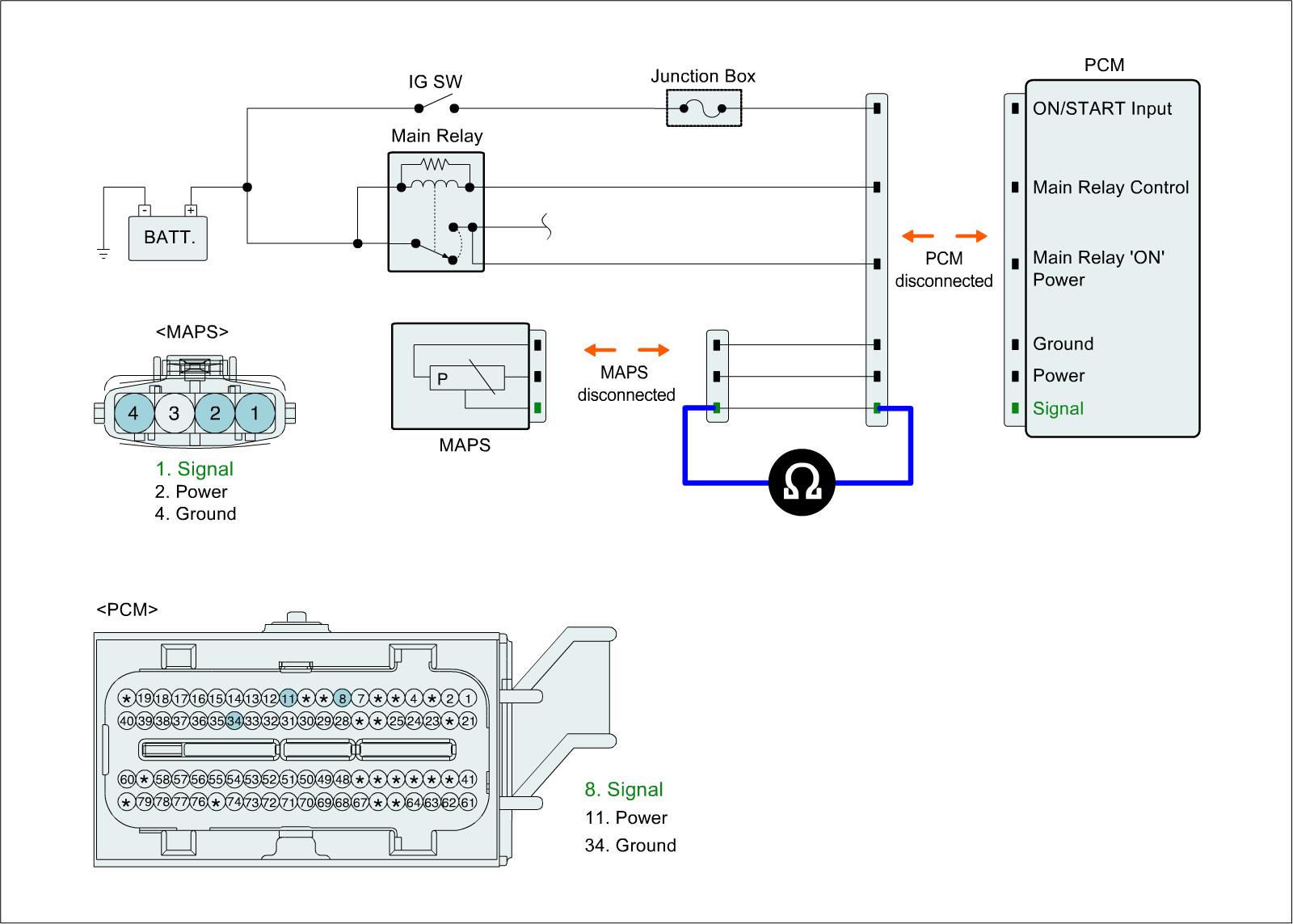 3. Measure the resistance between signal terminal of MAPS harness connector and MAPS signal terminal of PCM harness connector