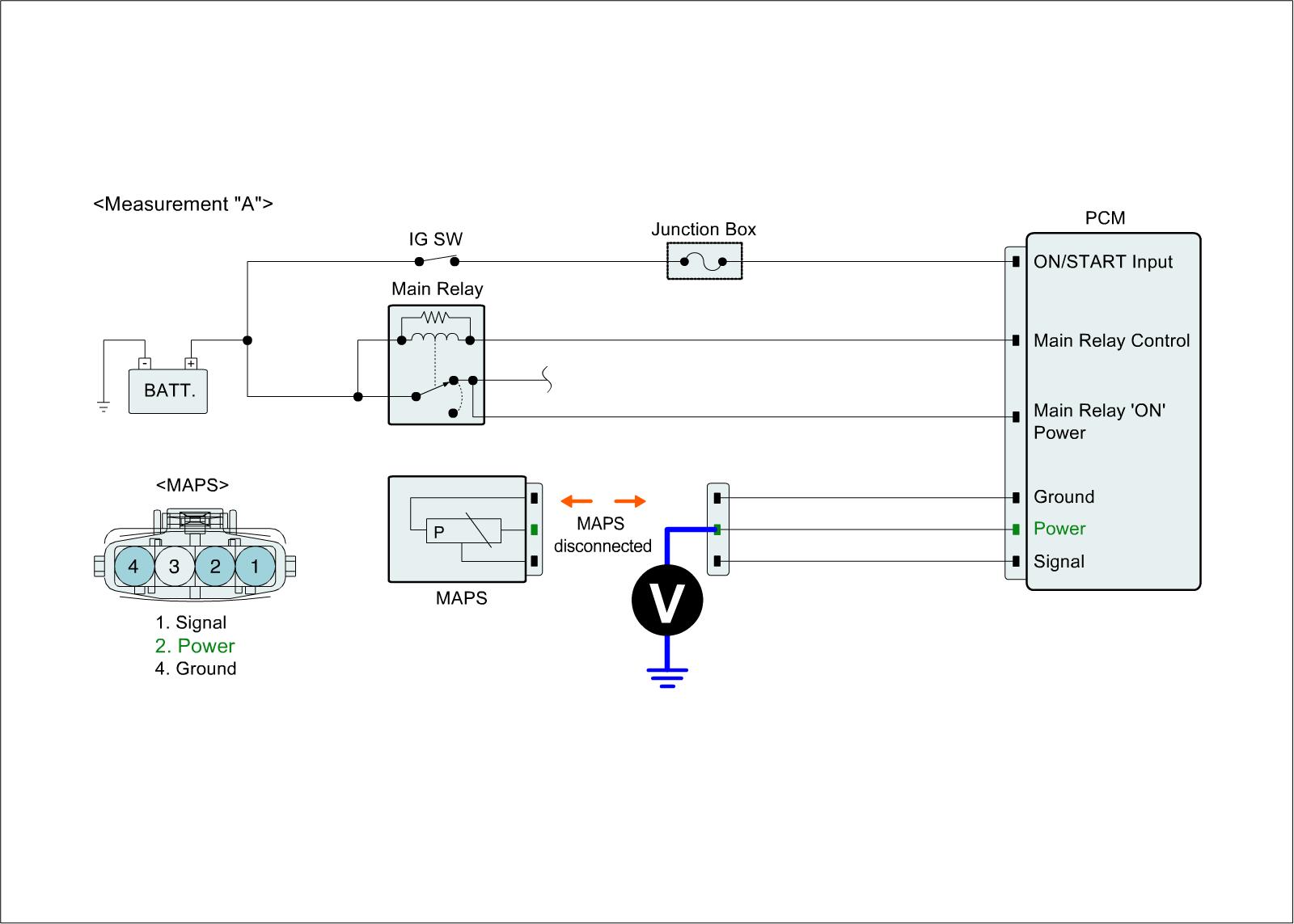 5. Measure the voltage between power and ground terminals of MAPS harness connector. (Measurement "B")