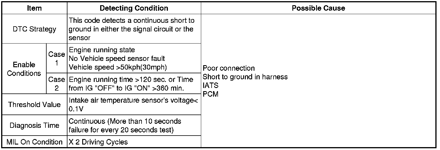 Checking output signals of IATS every 20 sec. under detecting condition, if an output signal is below 0.1 V for more than 10 sec, PCM sets P0112. MIL (Malfunction Indication Lamp) turns on when the malfunction lasts till consecutive 2 driving cycle.