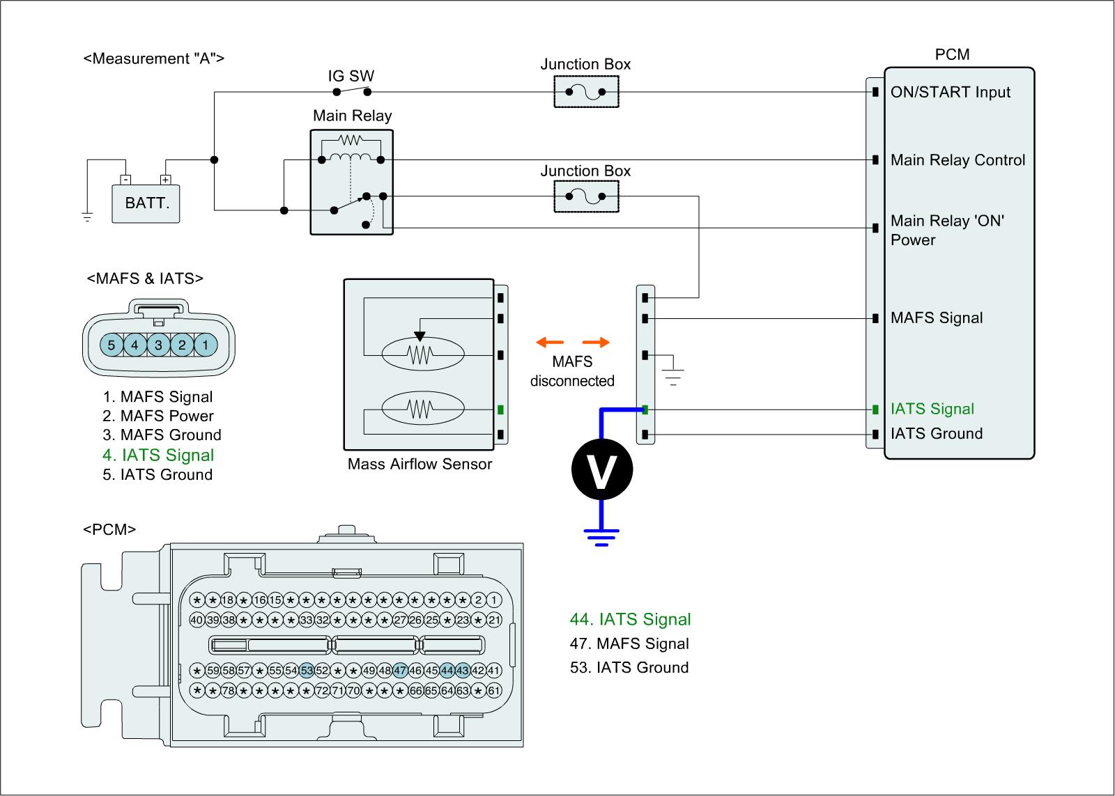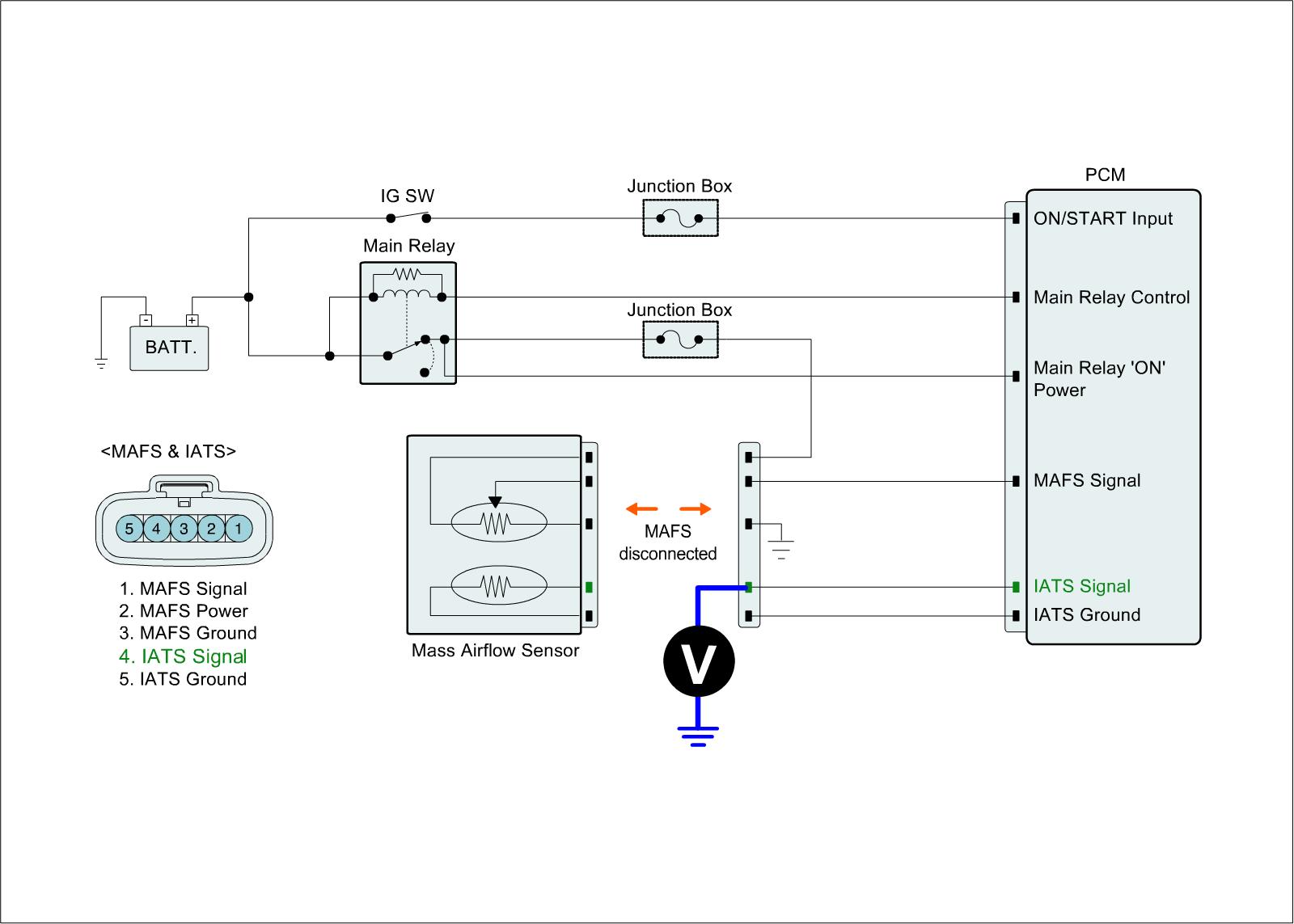 2. Measure resistance between signal terminal of IATS harness connector and power terminal of MAFS harness connector.