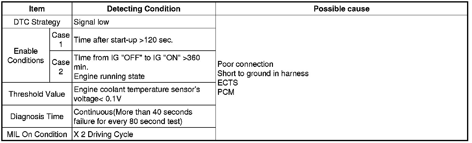 Checking output signals from ECTS every 80 sec. under detecting condition, if an output signal is below 0.1 V for more than 40 sec, PCM sets P0117. MIL (Malfunction Indication Lamp) turns on when the malfunction lasts till consecutive 2 driving cycle.
