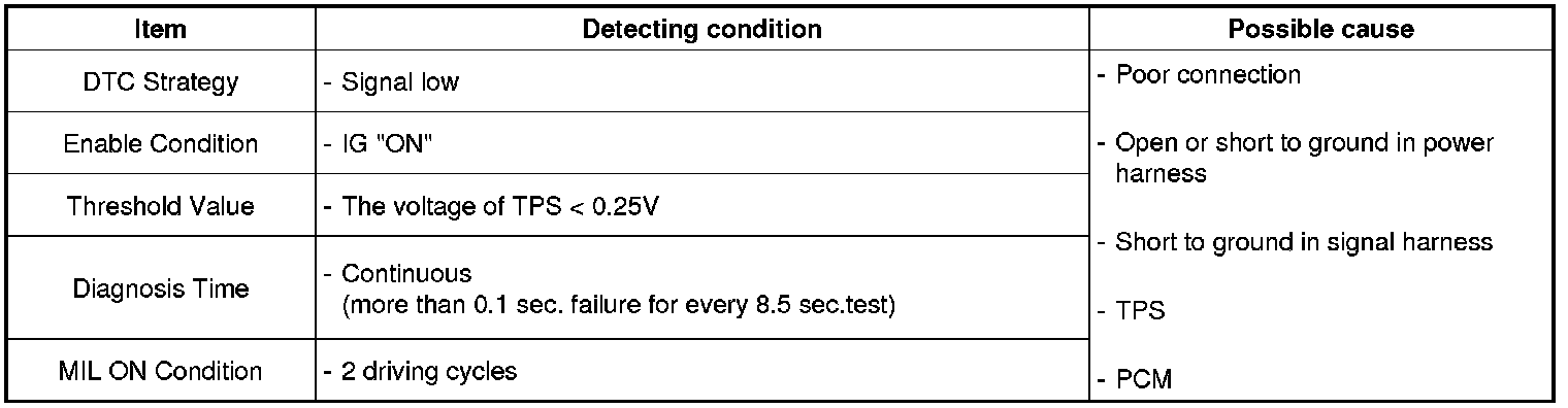 Checking output signals from TPS 1 every 8.5 sec. under detecting condition, if an output signal is below 0.25 V for more than 0.1 sec, PCM sets P0122. MIL (Malfunction Indication Lamp) turns on when the malfunction lasts till consecutive 2 driving cycle.
