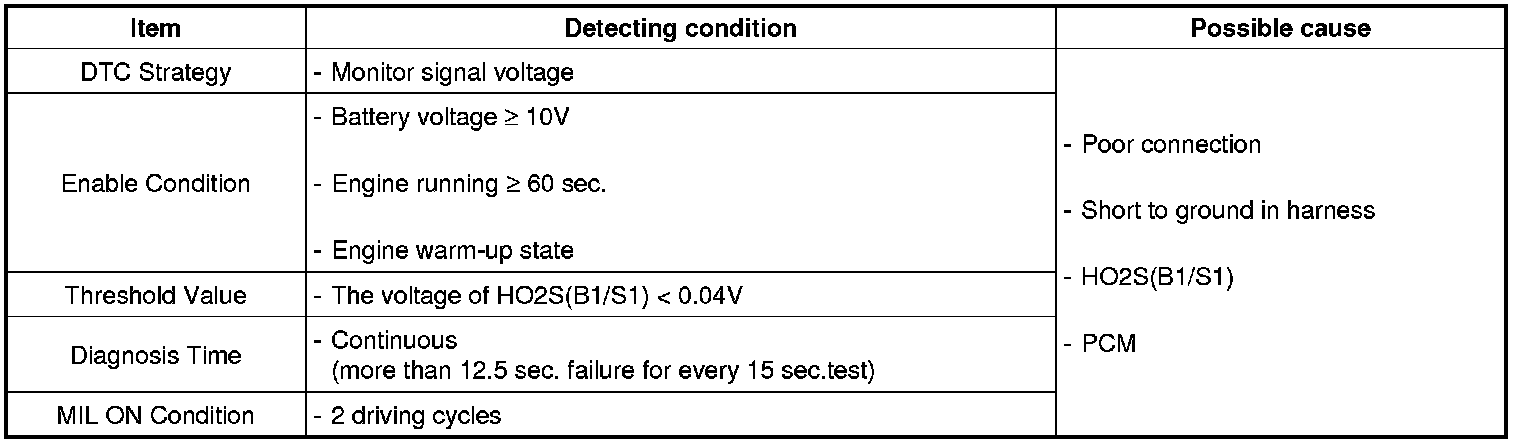 Checking output signals from HO2S under detecting condition, if an output signal is below 0.04 V for more than predeterminate time, PCM sets P0131. MIL (Malfunction Indication Lamp) turns on when the malfunction lasts till consecutive 2 driving cycle.