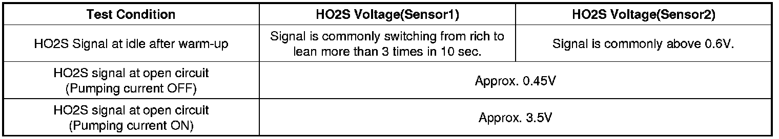 After warming-up, if accelerator pedal is released suddenly around 4000 rpm, the HO2S signal reading will be lower than 200 mV resulting from Fuel cut-off for the moment. Conversely, if suddenly accelerator pedal is depressed, HO2S signal reading will be around 0.6 V ~1.0 V. At idle, Normally HO2S signal will switch from lean to rich with 3 Hz. And as racing, Its frequency rises.