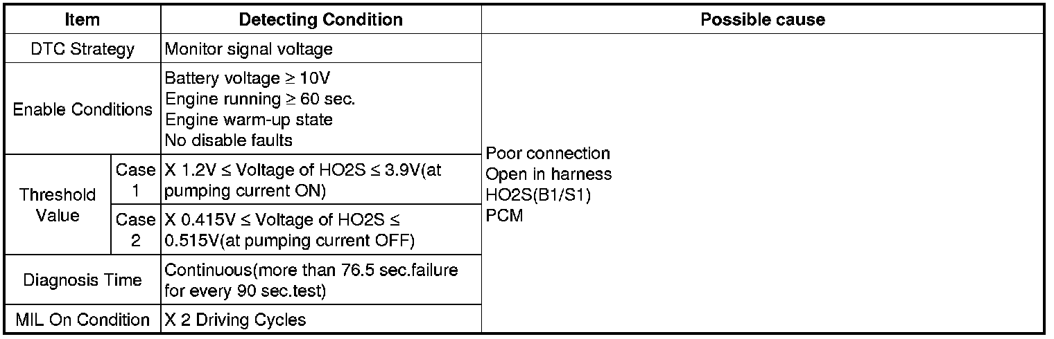 Checking output signals from HO2S under detecting condition, if an output voltage is approx.0.45 V or 3.5 V for more than predeterminate time, PCM sets P0134. MIL (Malfunction Indication Lamp) turns on when the malfunction lasts till consecutive 2 driving cycle.