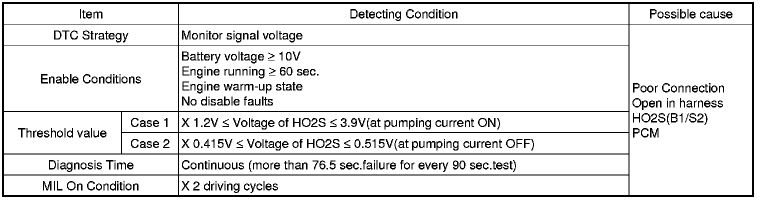 Checking output signals from HO2S under detecting condition, if an output voltage is approx.0.45 V or 3.5 V for more than predeterminate time, PCM sets P0140. MIL (Malfunction Indication Lamp) turns on when the malfunction lasts till consecutive 2 driving cycle.