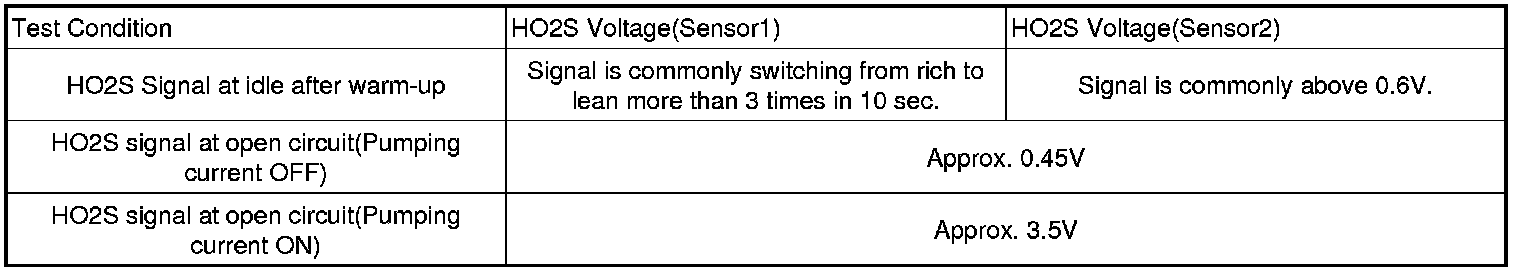 After warming-up, if accelerator pedal is released suddenly around 4000 rpm, the HO2S signal reading will be lower than 200 mV resulting from Fuel cut-off for the moment. Conversely, if suddenly accelerator pedal is depressed, HO2S signal reading will be around 0.6 V ~1.0 V. At idle, Normally HO2S signal will switch from lean to rich with 3 Hz. And as racing, Its frequency rises.