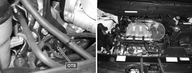 The fluid of the CVVT is the engine oil and its density changes according to the engine oil temperature. At this time the Oil Temperature Sensor (OTS) helps compensation against the temperature differences. The Oil Temperature Sensor measures the engine oil temperature before the engine oil comes into the Oil-flow Control Valve (OCV). According to the measured temperature, the Engine Control Module (PCM) compensates the oil-flow control valve operation time.
