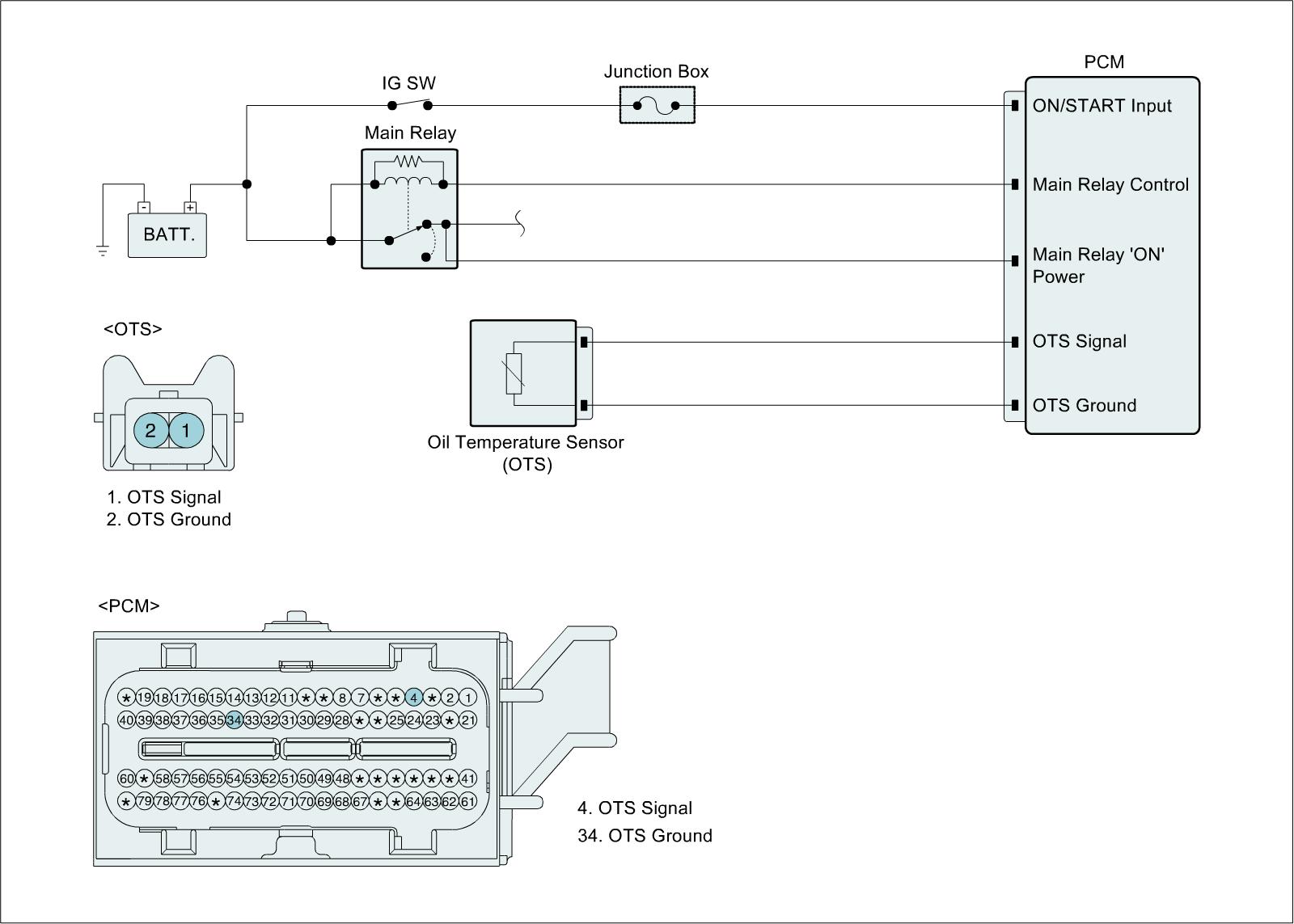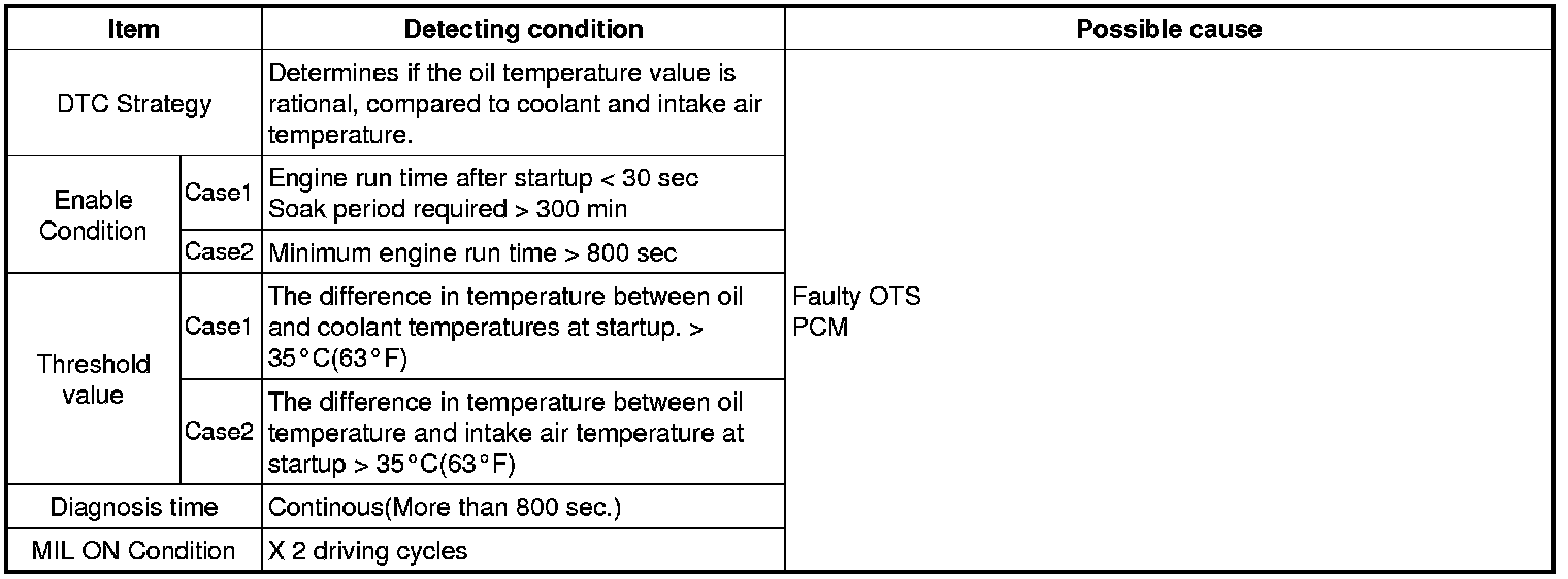 Checking the oil temperature, coolant temperature and intake air temperature every 25 sec. under detecting condition, if the difference in temperature at start-up exceeds threshold value, PCM sets P0196. MIL (Malfunction Indicating Lamp) turns on when the malfunction lasts till consecutive 2 driving cycle.