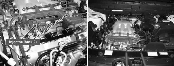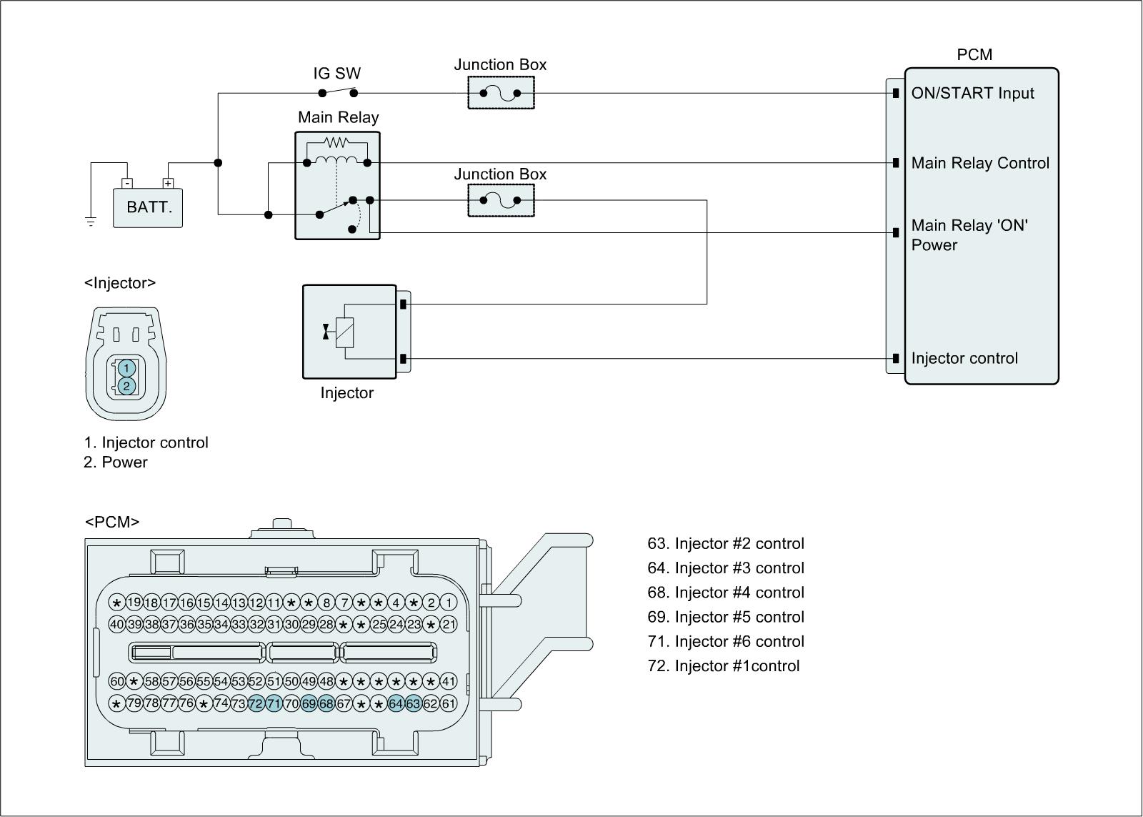 Based on information from various sensors, the PCM measures the fuel injection amount. The fuel injector is a solenoid-operated valve and the fuel injection amount is controlled by length of time the fuel injector is held open. The PCM controls each injector by grounding the control circuit. When the PCM energizes the injector by grounding the control circuit, the circuit voltage should be low (theoretically 0 V) and the fuel is injected. When the PCM de-energizes the injector by opening the control circuit, the fuel injector is closed and circuit voltage should momentarily peak.