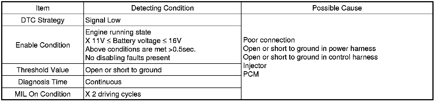 Checking output signals from injectors under detecting condition, if an output signal is low. PCM sets P0273. MIL (Malfunction Indication Lamp) turns on when the malfunction lasts till consecutive 2 driving cycle.