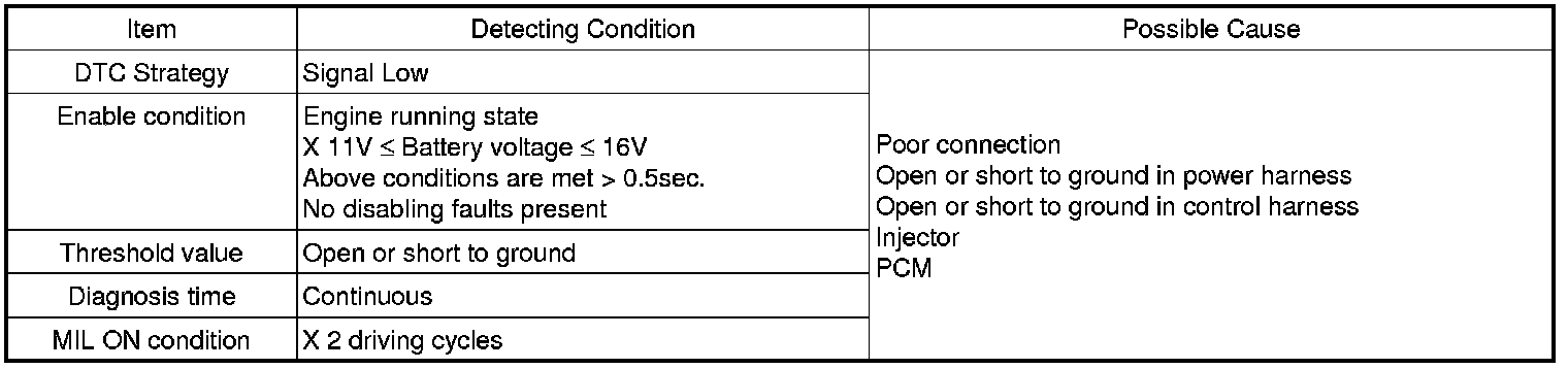 Checking output signals from injectors under detecting condition, if an output signal is low. PCM sets P0276. MIL (Malfunction Indication Lamp) turns on when the malfunction lasts till consecutive 2 driving cycle.