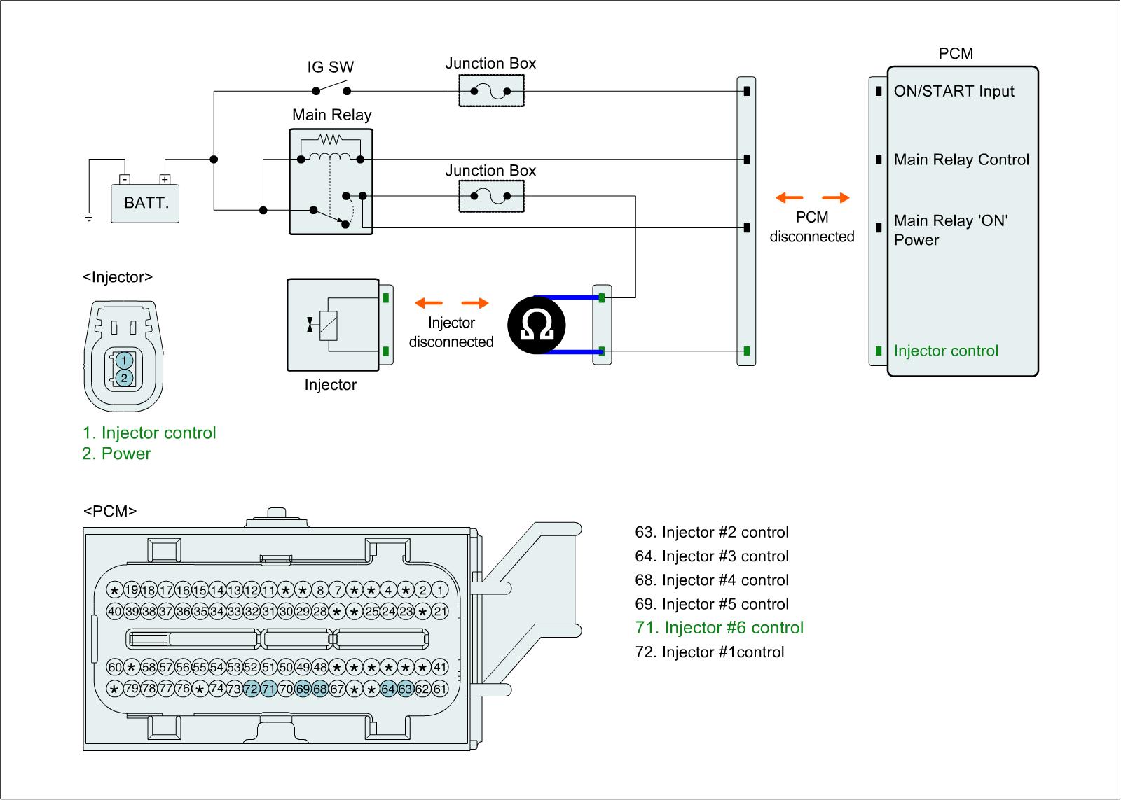 1. IG "OFF" and disconnect injector connector and PCM connector.