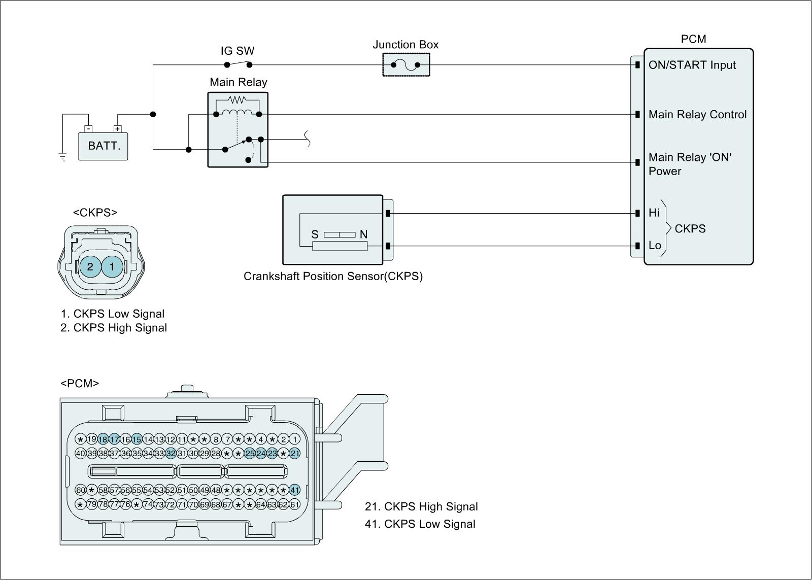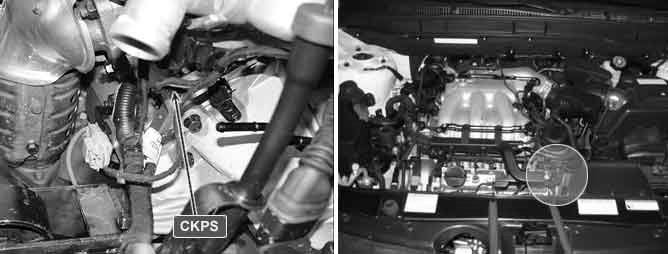 The Crankshaft Position Sensor (CKPS) is a magnetic field sensitive type sensor that generates voltage using a sensor and a target wheel mounted on the crankshaft; there are 58 slots in the target wheel where one is longer than the others. When the slot in the wheel aligns with the sensor, the sensor voltage outputs low. When the metal (tooth) in the wheel aligns with the sensor, the sensor voltage outputs high. During one crankshaft rotation there are 58 rectangular signals and one longer signal. The PCM calculates engine RPM by using the sensor's signal and controls the injection duration and the ignition timing. Using the signal differences caused by the longer slot, the PCM identifies which cylinder is at top dead center.