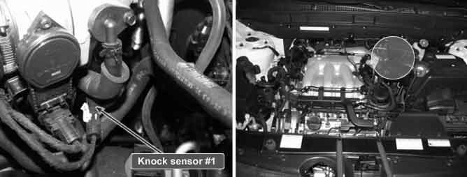 The knock sensor is attached to the cylinder block and senses engine knocking. The sensor contains a piezoelectric element that converts vibration (or noise) into voltage signal and sends this signal to PCM. With input signals from camshaft position and crankshaft position sensor, PCM can identify which cylinder is knocking. PCM filters vibrations and determines if the vibrations are knocking signal. The PCM uses this signal to suppress knocking by retarding ignition timing. The PCM will set a code (Malfunction Indicator Lamp will Not turn on) if during two driving cycles the Knock sensor's output voltage falls below minimum threshold. This code indicates an unexpected vibration is being read by the Knock sensor or PCM under normal engine operation.