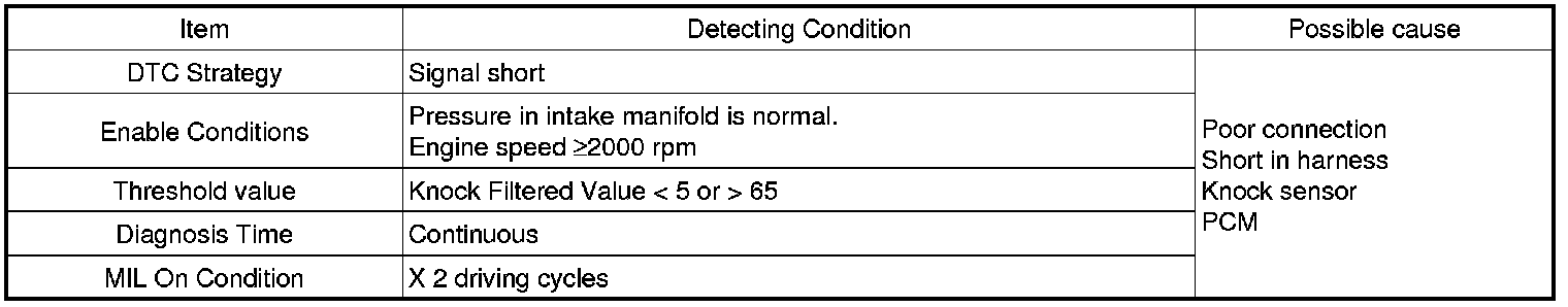 Checking the range of input signal with a knock sensor under detecting condition, PCM senses short in knock sensor circuit or malfunction of sensor. If the filtered knock signals are out of the threshold value. PCM sets P0326.