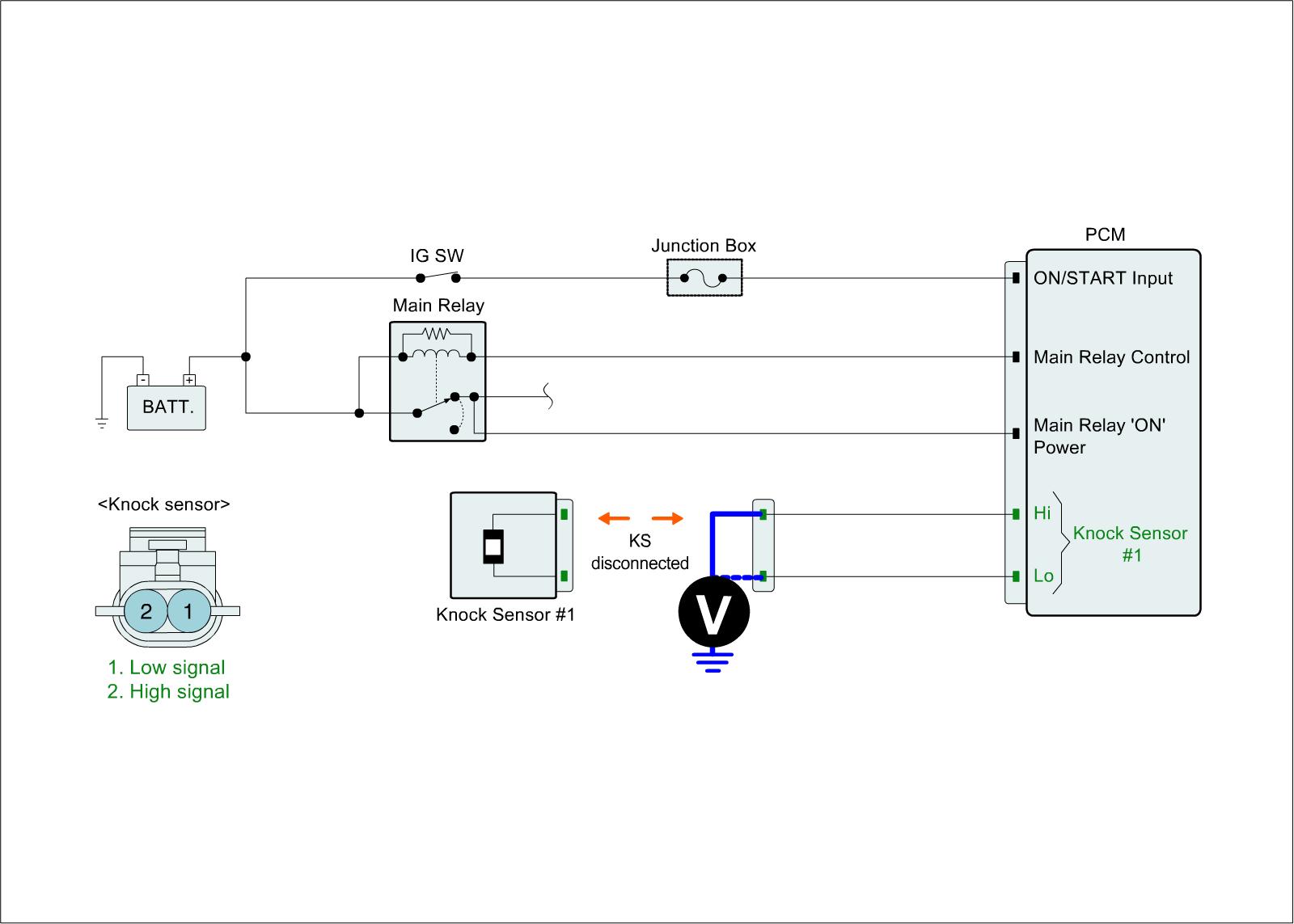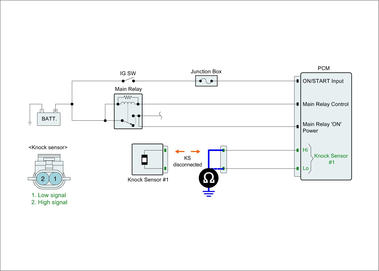 1. IG "OFF" and disconnect knock sensor connector and PCM connector.