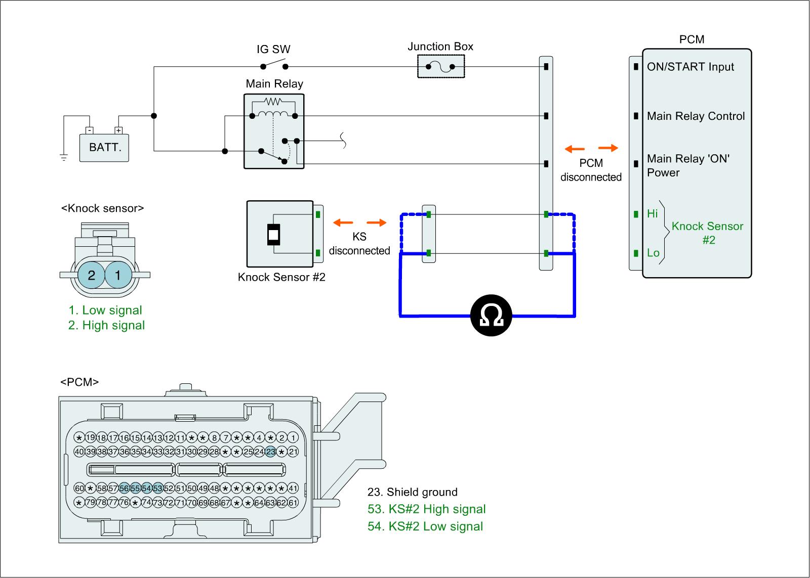 1. IG "OFF" and disconnect knock sensor connector and PCM connector.