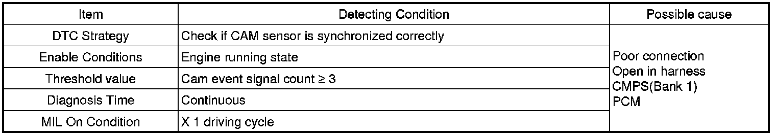 If PCM detects that cam event signal count is over 3 under detecting condition, PCM sets P0340. MIL (Malfunction Indication Lamp) turns on.