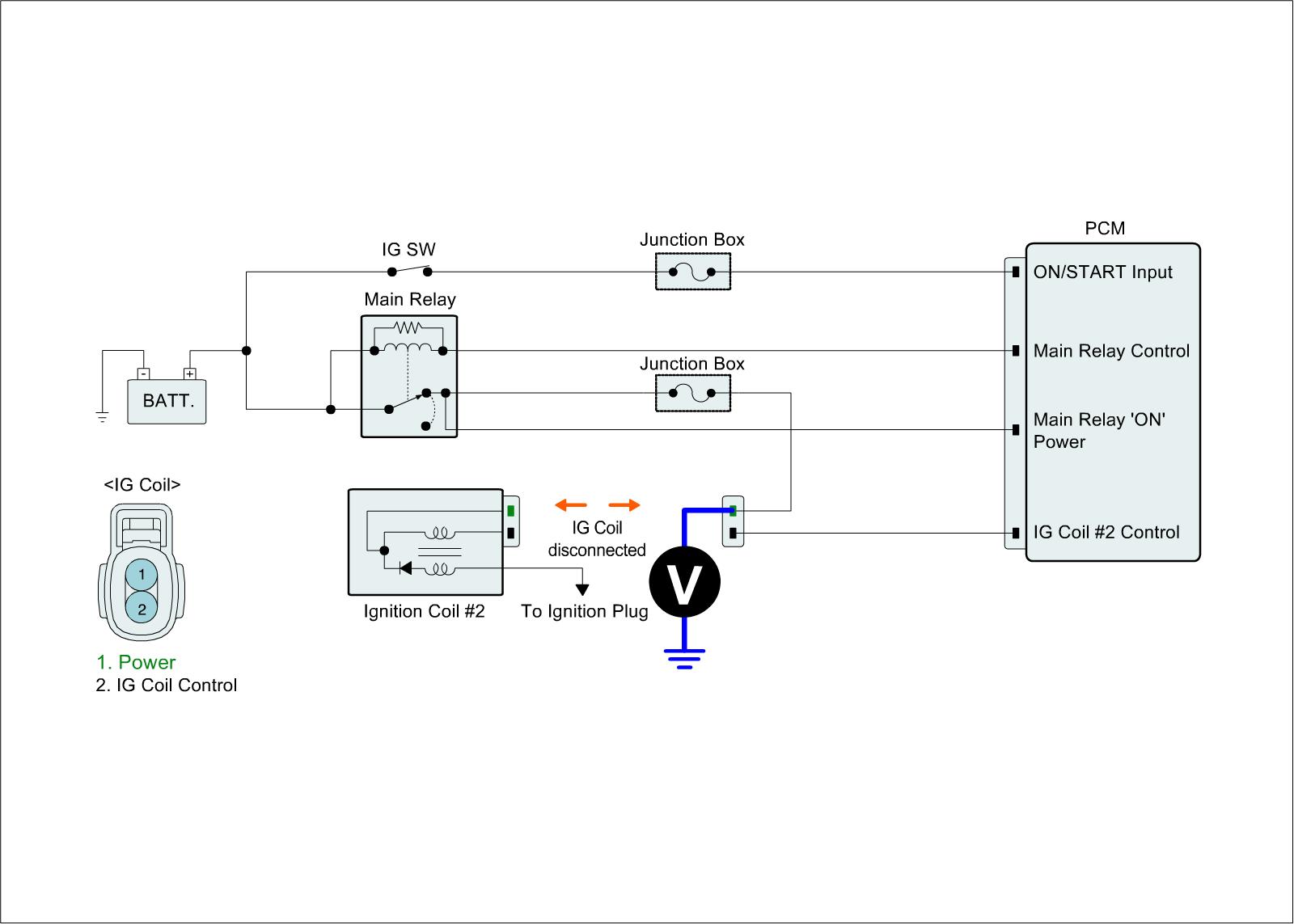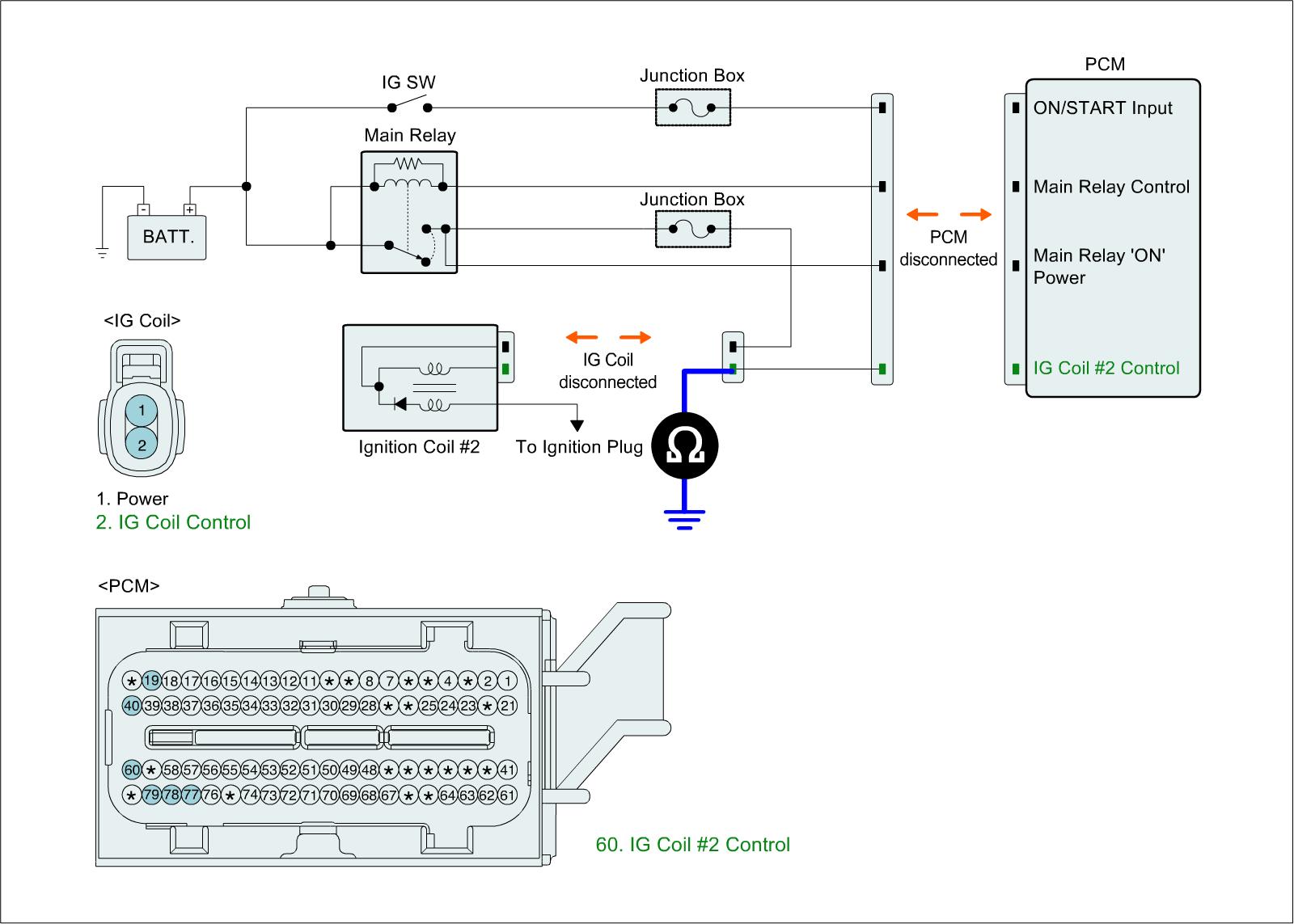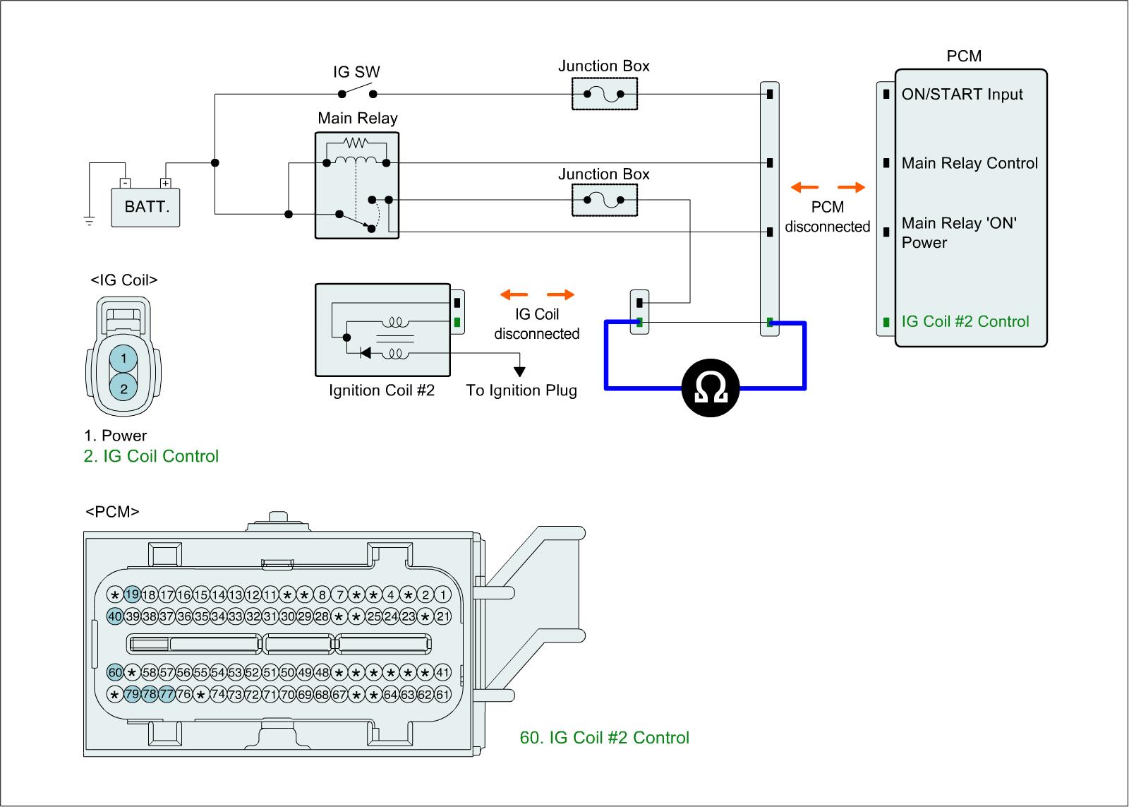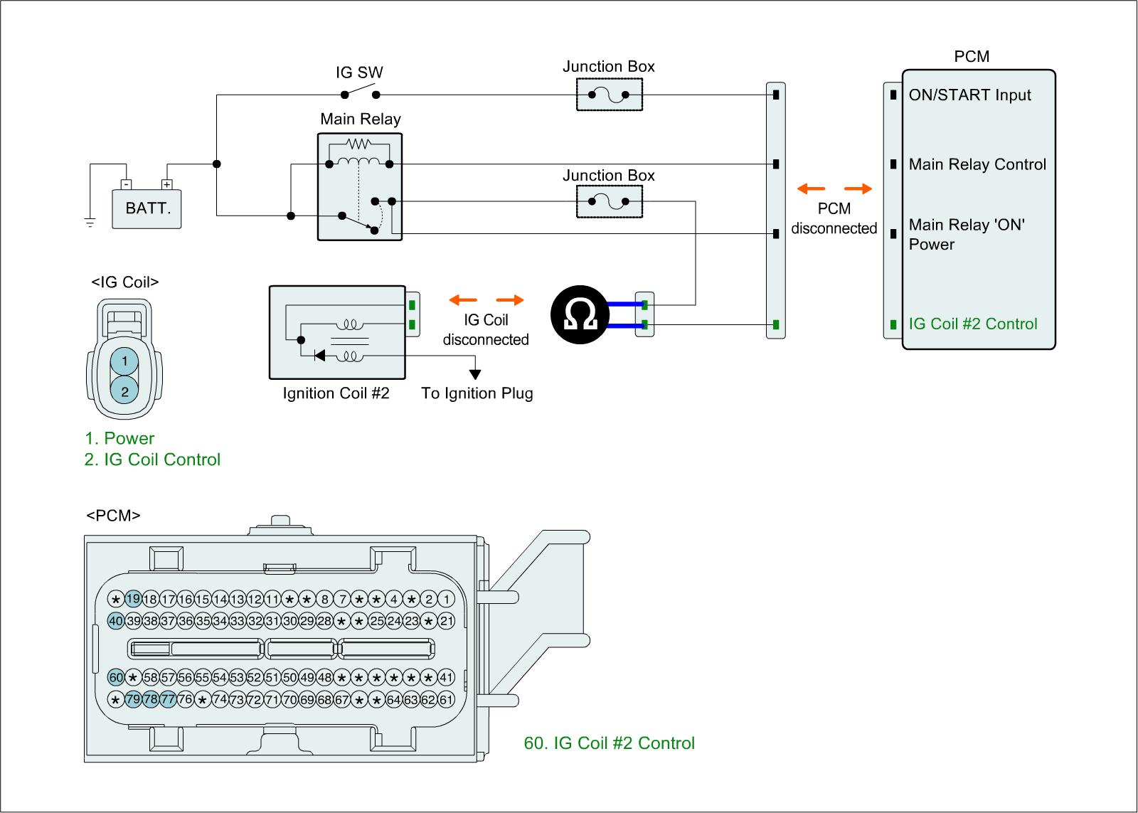 1. IG "OFF" and disconnect Ignition Coil #2 connector and PCM connector.