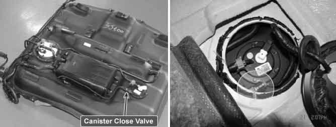 The evaporative emissions system prevents hydrocarbon (HC) vapors from the fuel tank from escaping into the atmosphere where they could form photochemical smog. Gasoline vapors are collected in the charcoal canister. The Canister Closing Valve (CCV) closes off the air inlet into the canister for leak detection of the evaporative emission system. The CCV also prevents fuel vapors from escaping from the canister. When the engine purges the HC vapors from the canister, the clean air comes into the canister through the canister air-filter and the CCV.