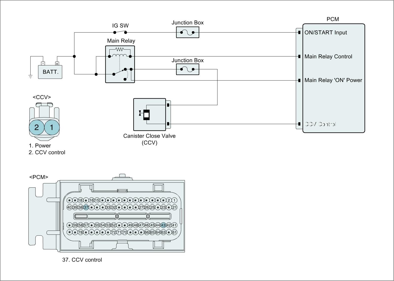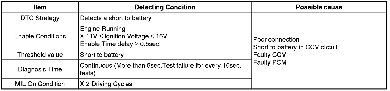 Checking output signals from CCV every 10 sec. under detecting condition, if signals indicating short to battery in the circuit are detected for more than 5 sec, PCM sets P0448. MIL (Malfunction Indication Lamp) turns on when the malfunction lasts till consecutive 2 driving cycle.