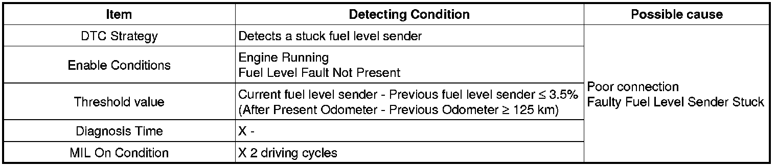 Checking fuel level change under detecting condition, if the fuel level difference between current and previous is lower than 3.5% while odometer difference between present and previous is higher than 125 km, PCM sets P0461. MIL (Malfunction Indication Lamp) turns on when the malfunction lasts till consecutive 2 driving cycle.