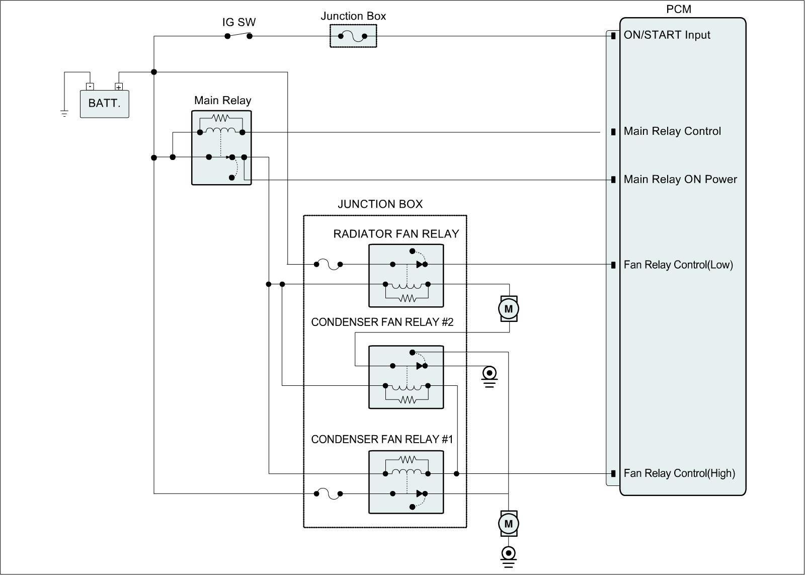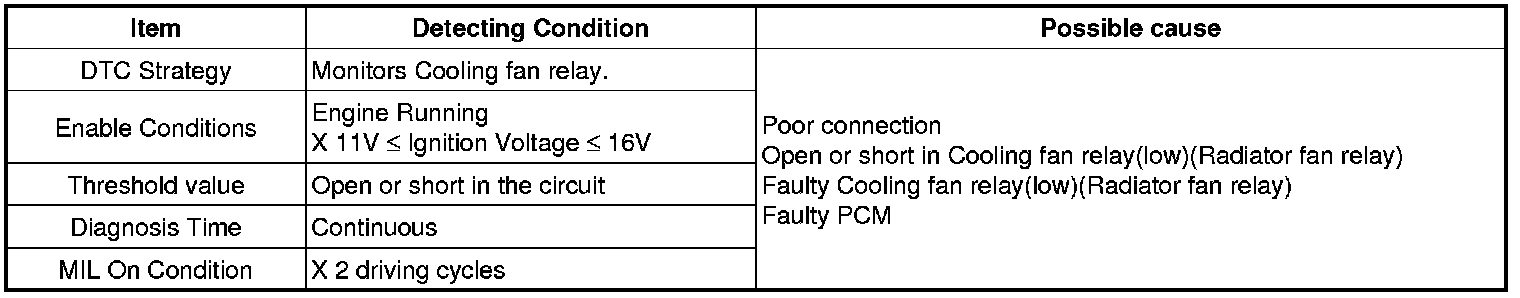 If the PCM detects short to ground, to battery or open circuit in the Cooling fan relay (low), PCM sets P0480. MIL (Malfunction Indication Lamp) turns on when the malfunction lasts till consecutive 2 driving cycle.
