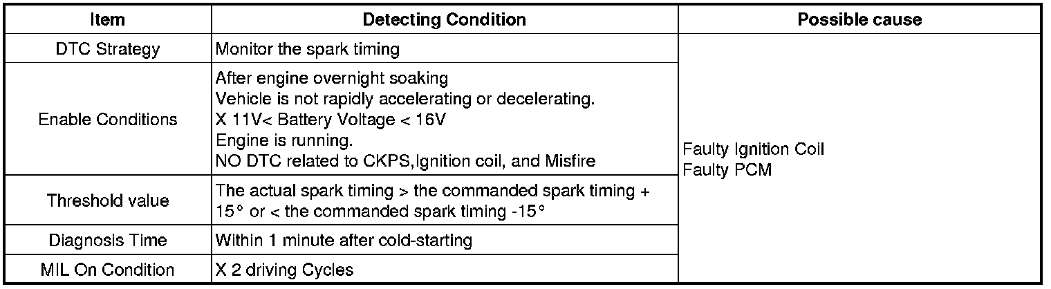 Checking spark timing under detecting condition, if the actual spark timing differs from the commanded spark timing, PCM sets this DTC. MIL (Malfunction Indication Lamp) turns on when the malfunction lasts till consecutive 2 driving cycle.