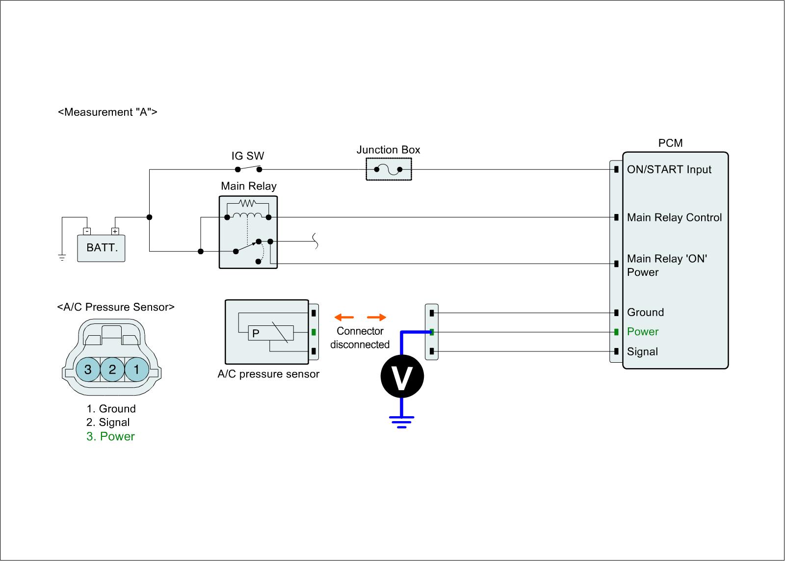 4. Measure the voltage between power terminal of A/C pressure sensor harness connector and chassis ground. (Measurement "A")