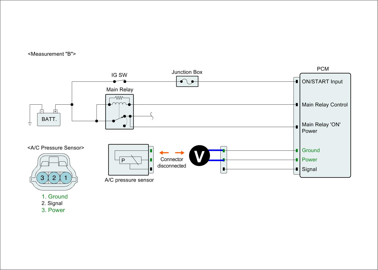 5. Measure the voltage between power and ground terminals of A/C pressure sensor harness connector. (Measurement "B")