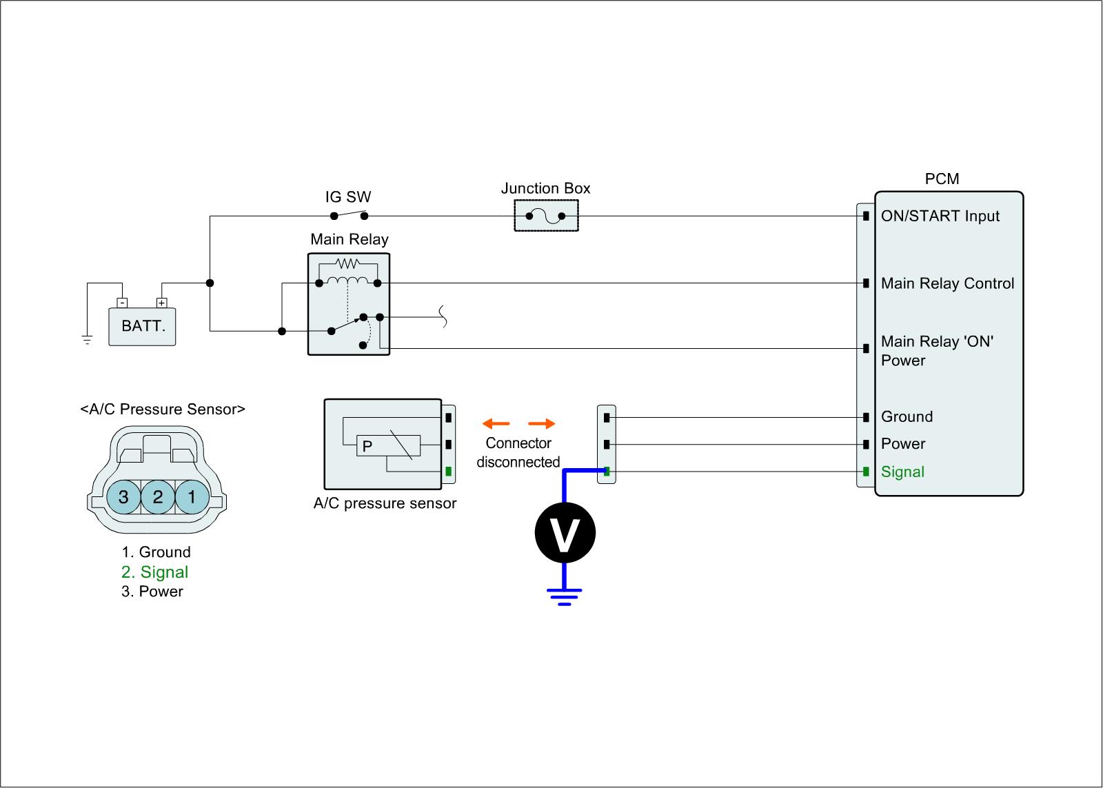 4. Measure the voltage between signal terminal of A/C pressure sensor harness connector and chassis ground.