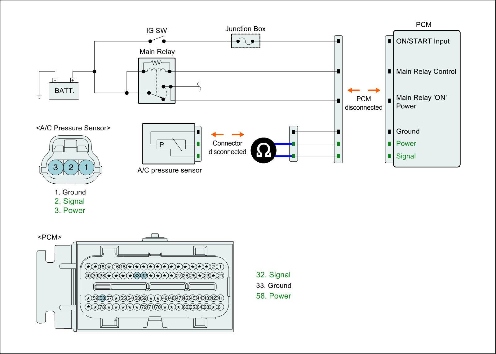 2. Disconnect A/C pressure sensor connector and PCM connector.