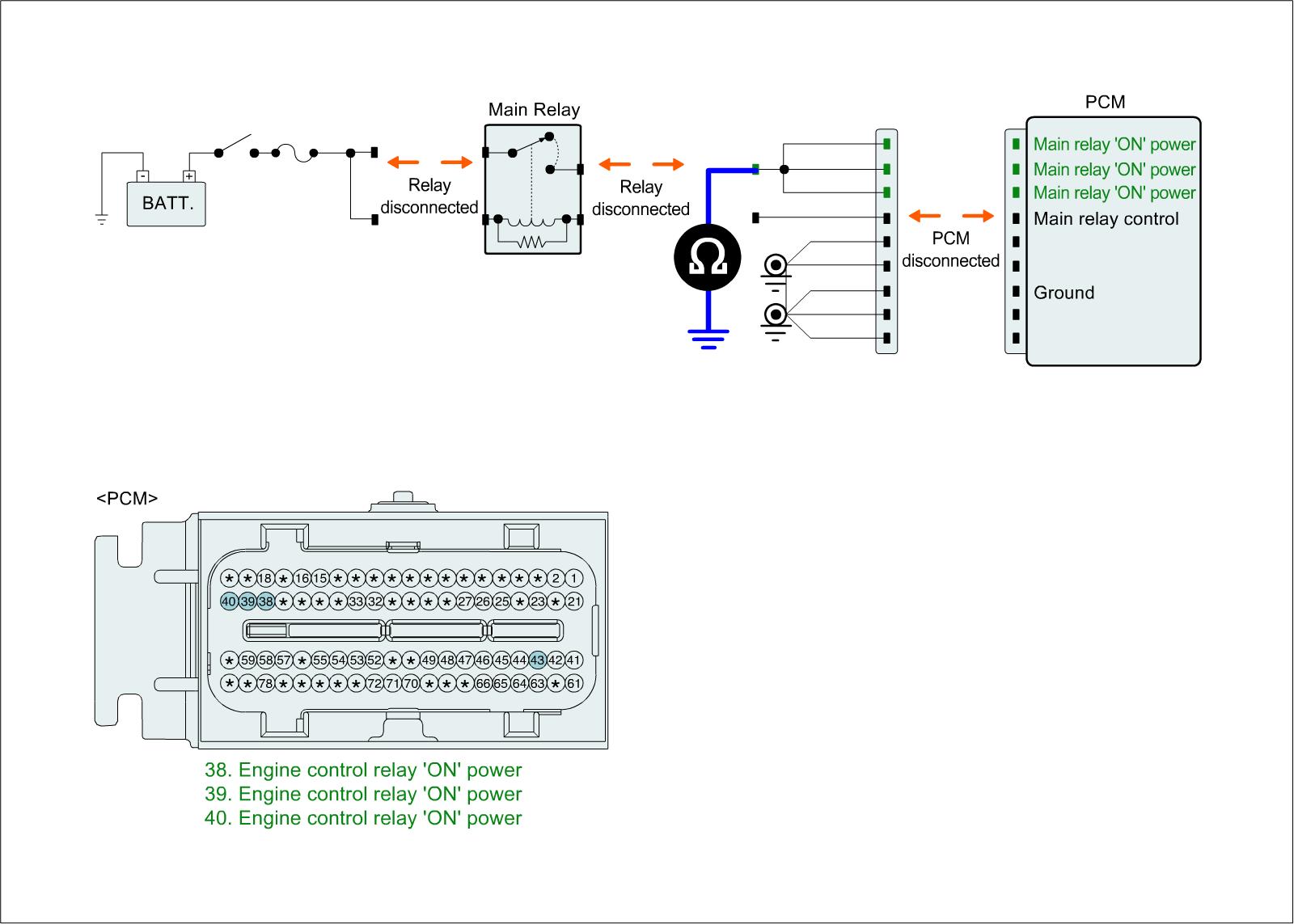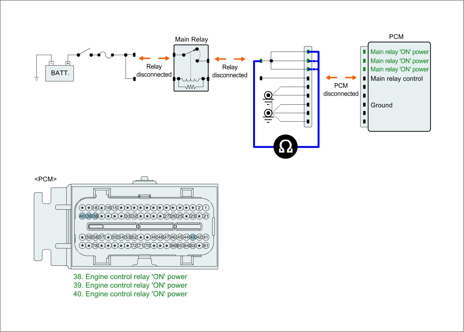 3. Measure the resistance between main relay "ON" power terminal of main relay harness connector and main relay "ON" power terminals of PCM harness connector.